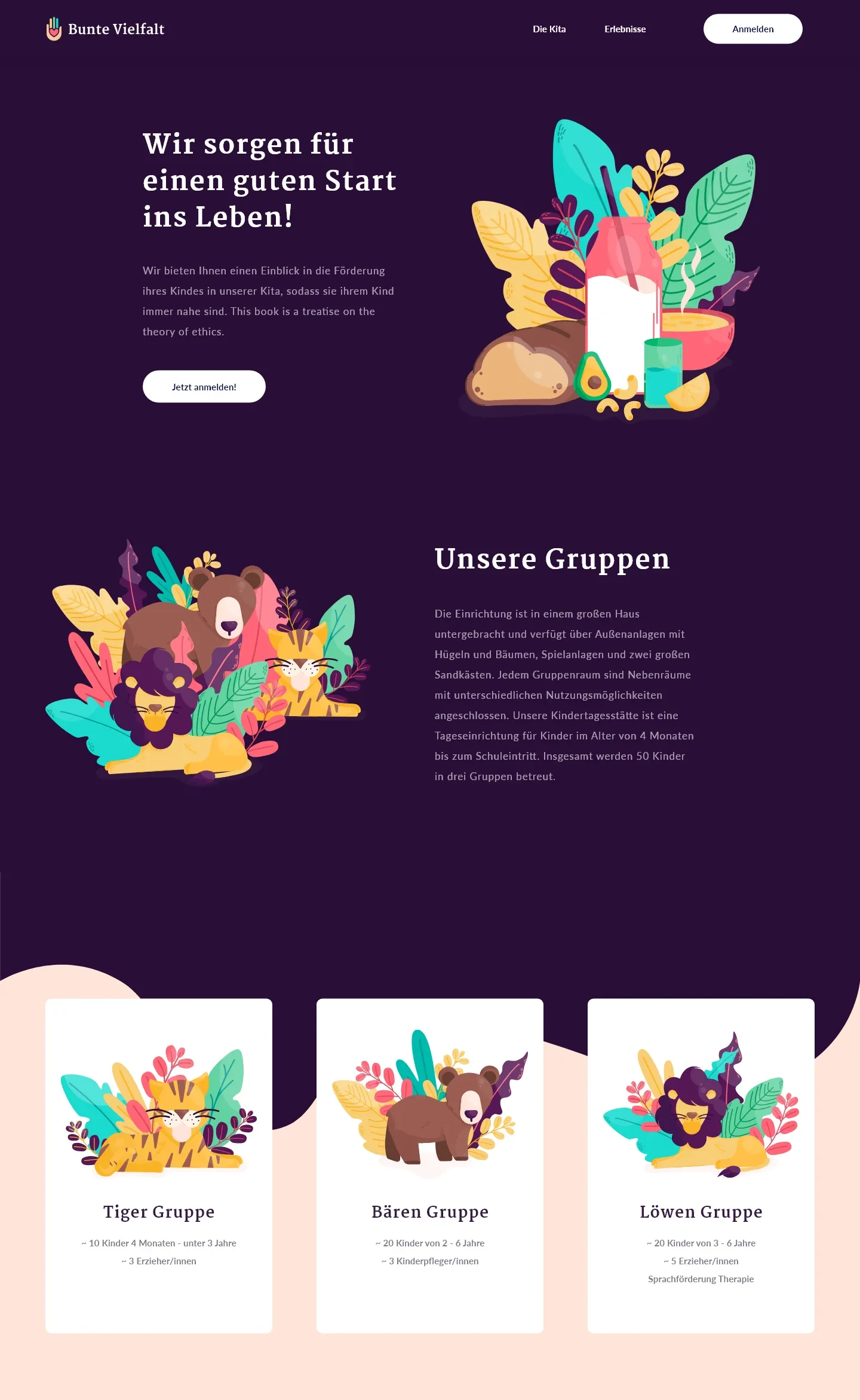 Once the branding was set, we carried the art direction into the web, shaping a clear narrative through layout, color, and illustrations. The result is a welcoming, accessible experience that reflects the brand’s voice. Explore it at bunte-vielfalt.eu